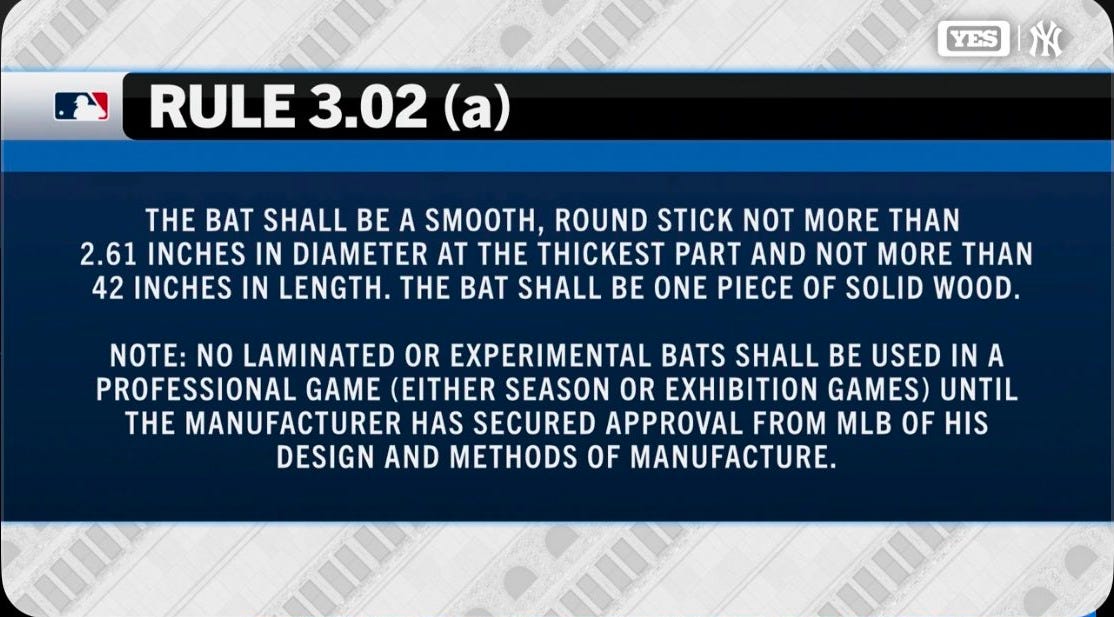 People on X like to comment about the bats calling the Yankees cheaters. They are not. The bats were approved by MLB, and that was confirmed to ball clubs after the revelation yesterday. Here is what the MLB official rules say: